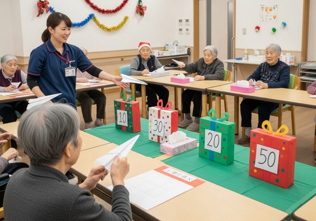 参加者各自で紙ひこうきを折り (必要な場合はスタッフがサポート)、会場に設置した的(ティッシュ箱や点数を書いた的など)に向かって順番に飛ばします。得点を記録して競争形式にすると盛り上がります。